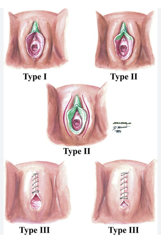 In the image above, the green areas represent the tissue that is excised in each form of “female genital mutilation.” The Somali versions are the two images in the last row.