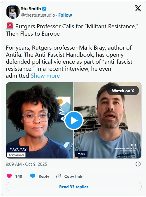 Within hours of being named at Trump’s roundtable, Mark Bray, the self-proclaimed ANTIFA historian and Rutgers professor, announced he was leaving the country. Bray’s panic was revealing — because just after his name came up, Stop Cop City posted an official response on a well-known anarchist website, calling on supporters to join new “No Kings” protests nationwide.